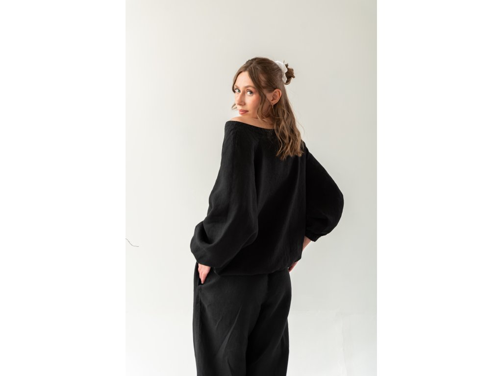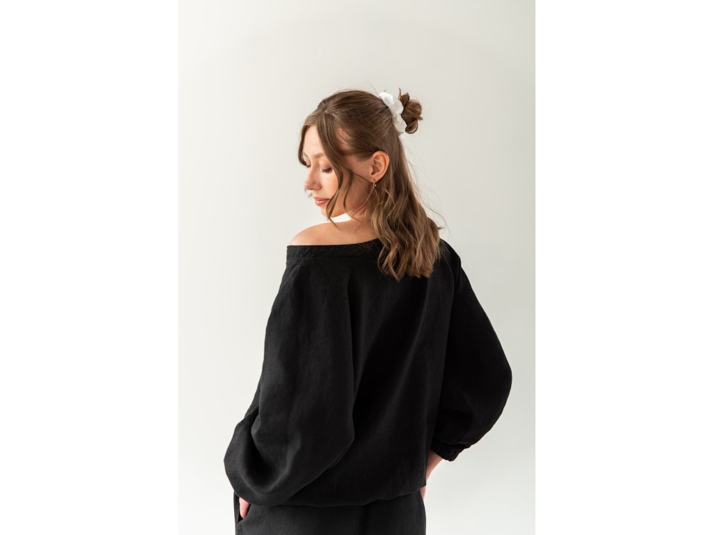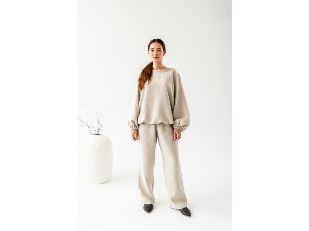 Die Leinen-Tunique im Schnitt eines lockeren Sweatshirts ist als Alltagsteil für Bewegung und Ruhe konzipiert. Sie verbindet die Natürlichkeit des Materials mit unserem experimentellen Designverständnis. Die Oversize-Tunique mit Raglanärmeln in Ballonform, die durch ein dezentes Gummiband zusammengehalten werden, schafft eine ungewöhnliche, aber natürlich elegante Silhouette, die entspannt und zugleich anspruchsvoll wirkt. Ein flacher Rundhalsausschnitt betont sanft die Schlüsselbeine und verleiht der Tunique einen femininen Akzent. Der Ausschnitt ist nicht tief, kann jedoch je nach Schulterstellung oder Bewegung dezent verrutschen und die Schulter leicht freilegen – ein sehr weibliches Detail, das der Tunique eine ungezwungene Sinnlichkeit verleiht.
