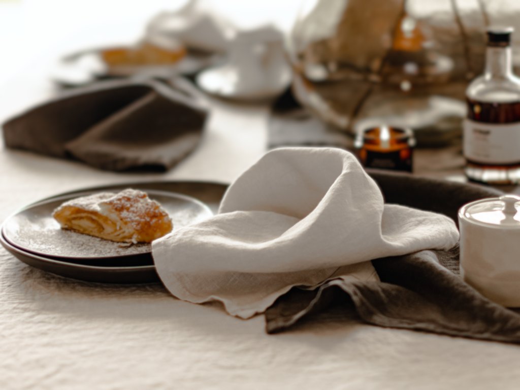 Ein feiner Saum hält die Form, ohne die natürliche Freiheit des Leinens einzuschränken. Die Serviette ist nicht nur ein praktisches Accessoire – sie ist ein kleines Ritual, das daran erinnert, dass Frühstück, Mittagessen, die Teestunde oder ein festliches Abendessen es verdienen, innezuhalten und sie in voller Präsenz zu erleben.