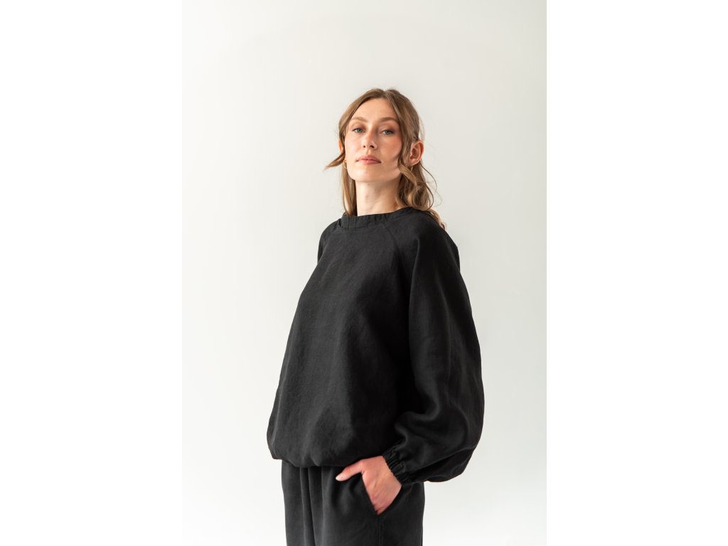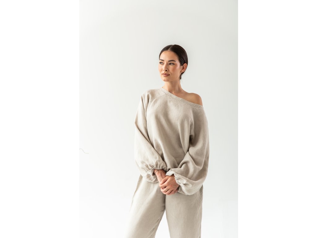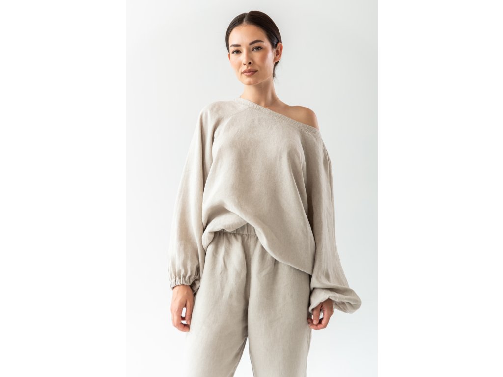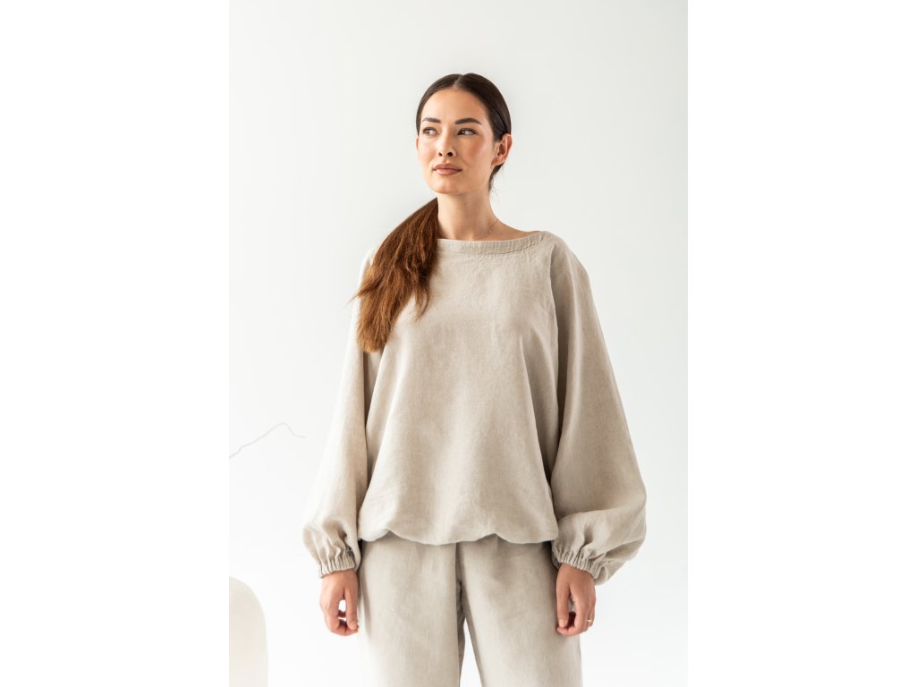 Linen top in a loose sweatshirt-style cut is designed as an everyday piece for movement as well as rest. It combines the natural quality of the material with our experimental approach to tailoring. The oversized top with raglan balloon sleeves gathered with a delicate elastic creates an unusual yet naturally elegant silhouette that feels relaxed and sophisticated. A shallow, softly curved neckline subtly highlights the collarbones and adds a feminine accent. The neckline is not deep, but depending on shoulder position or movement, it may gently slip and lightly reveal the shoulder, creating a very feminine detail that gives the top an effortless sensuality.
