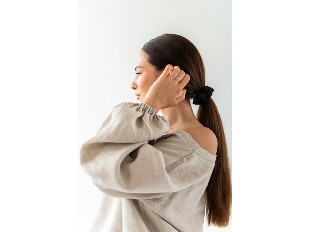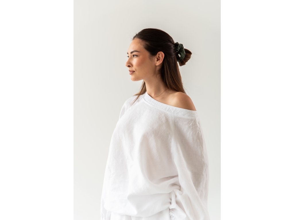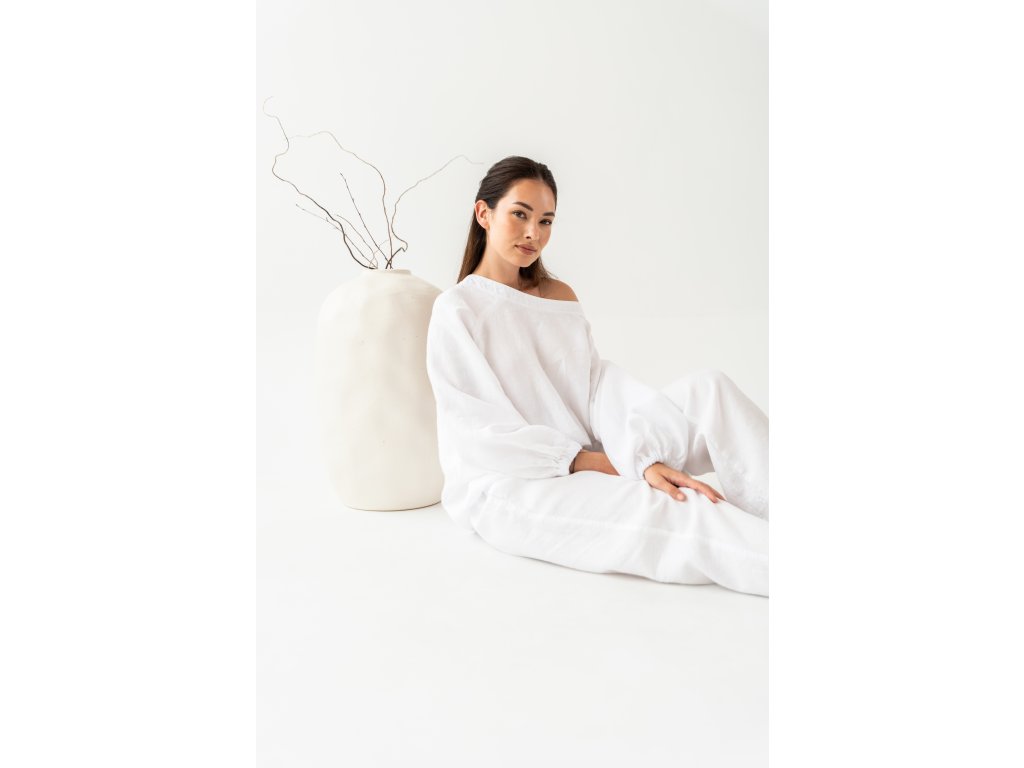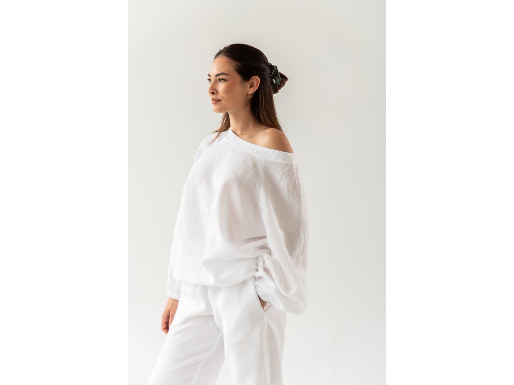 Linen top in a loose sweatshirt-style cut is designed as an everyday piece for movement as well as rest. It combines the natural quality of the material with our experimental approach to tailoring. The oversized top with raglan balloon sleeves gathered with a delicate elastic creates an unusual yet naturally elegant silhouette that feels relaxed and sophisticated. A shallow, softly curved neckline subtly highlights the collarbones and adds a feminine accent. The neckline is not deep, but depending on shoulder position or movement, it may gently slip and lightly reveal the shoulder, creating a very feminine detail that gives the top an effortless sensuality.